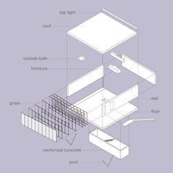 建築構成は無柱空間のワンルームを2階に配置し、1階はRCのヴォリュームの中に倉庫を計画している。2階の大半は宙に浮いた状態で位置しており、1階部分は将来的に砂に埋設することを想定している。内部構成は利用する人が自由に可変できるように、間仕切壁を設置するのではなく、ガラス引戸により使用する人が自由に可変させ、ガラスの積層によって生じる領域認識によって、空間を成立させている。この建築では、ガラス引戸は心地よい距離感・空間をつくり出し、様々なシーンをつくり出せる装置となる。